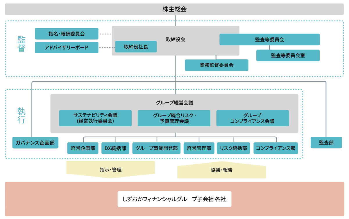 当社は、銀行持株会社として、グループ各社の経営および業務を管理・監督することで、グループガバナンス体制の強化を図っています。当社の機関設計は「監査等委員会設置会社」であり、取締役会による監督機能および監査等委員会による監査機能の強化等コーポレート・ガバナンス体制の拡充を図っております。